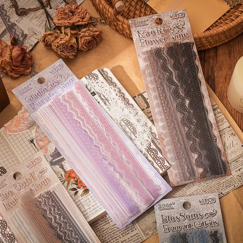 Set de 40 cintas adhesivas decorativas ideales para journaling, scrapbooking, decoración de cartas, agendas o proyectos DIY. Cada hoja presenta diseños únicos y encantadores, organizados en 6 series surtidas que se entregan al azar.