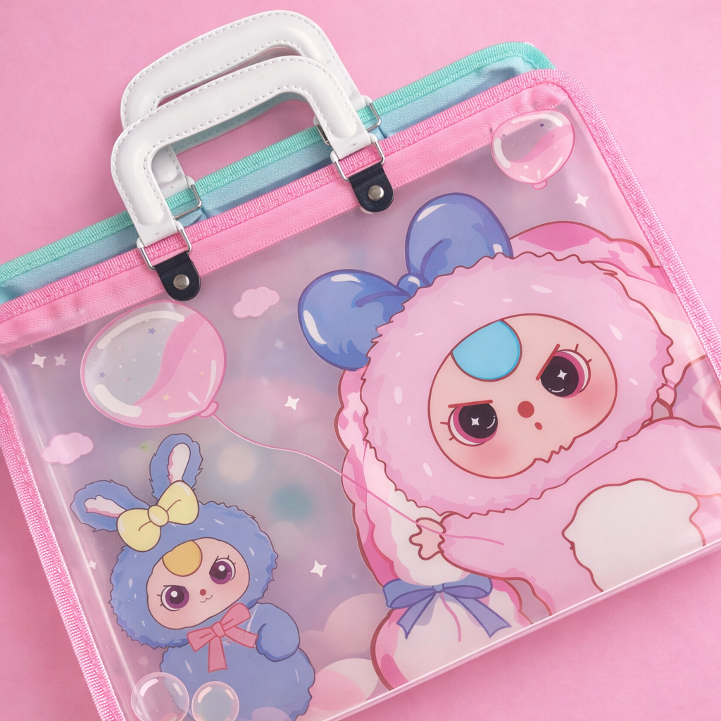 Mantén tus papeles organizados y seguros con esta práctica y adorable bolsa transparente Baby Three, ¡ahora con gancho para colgar donde quieras!