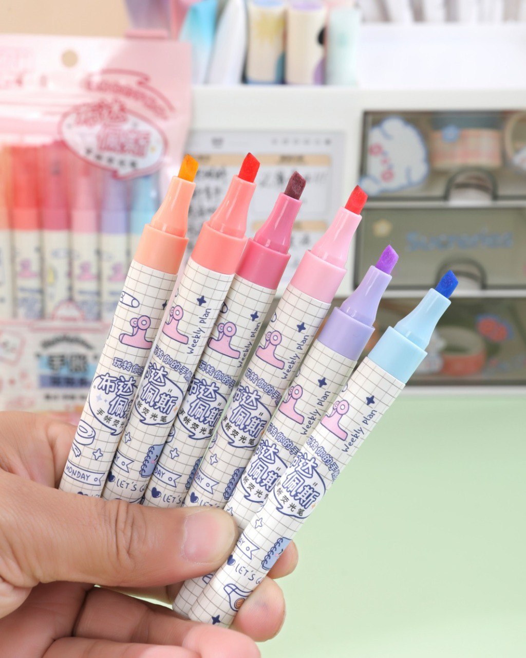 Cada destacador mide 12.2 cm y viene en una práctica bolsa de PVC, ideal para llevar a la escuela o al trabajo.