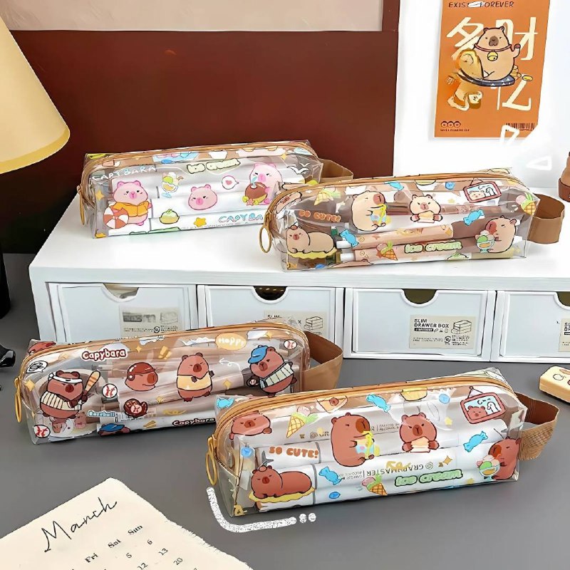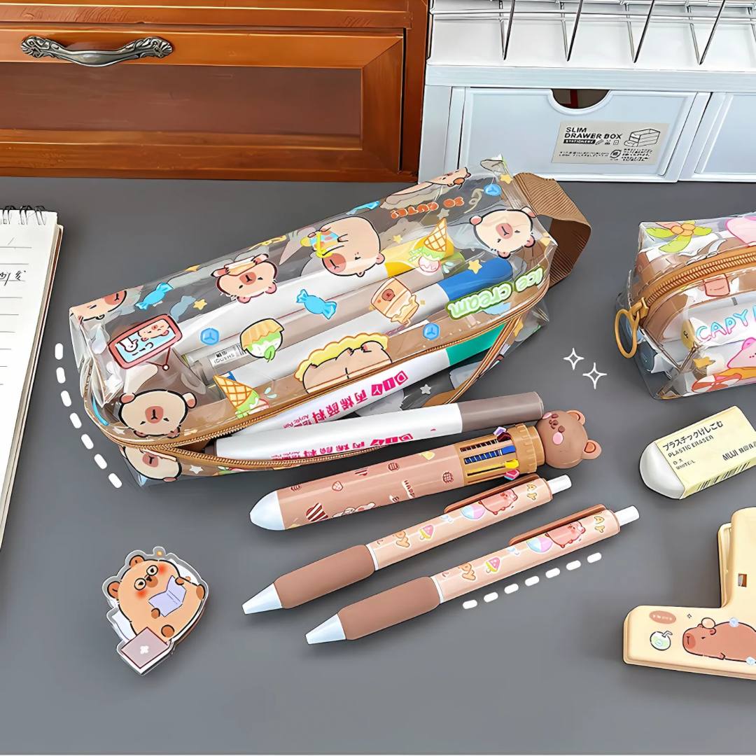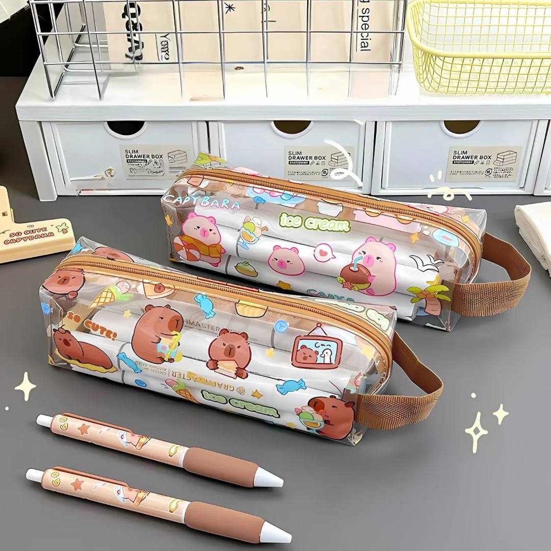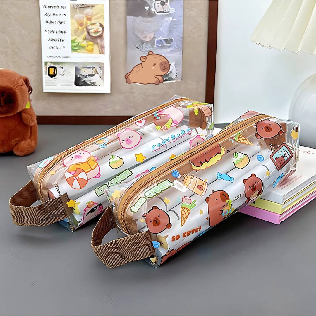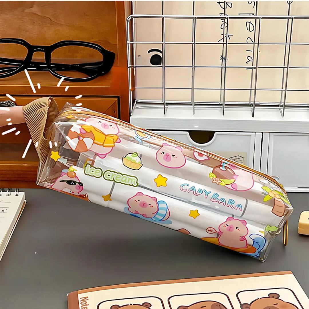 Organiza tus útiles escolares o de oficina con este estuche transparente de lápices capybara, hecho de PVC resistente.
