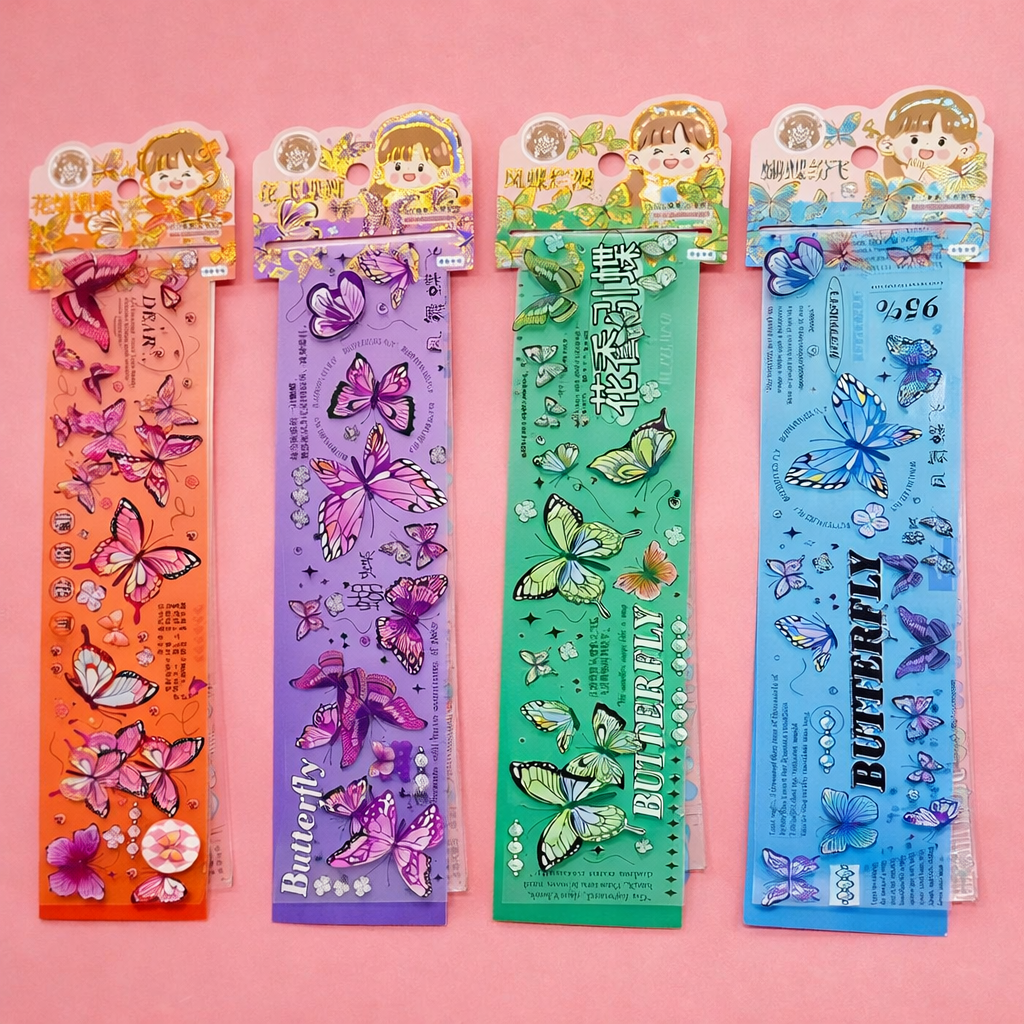 Estas Lamina stickers de mariposa son la elección perfecta para quienes buscan pegatinas decorativas versátiles y hermosas. Con sus generosas dimensiones de 6 x 50 cm, cada lámina ofrece una amplia variedad de calcomanías que pueden utilizarse de múltiples formas.