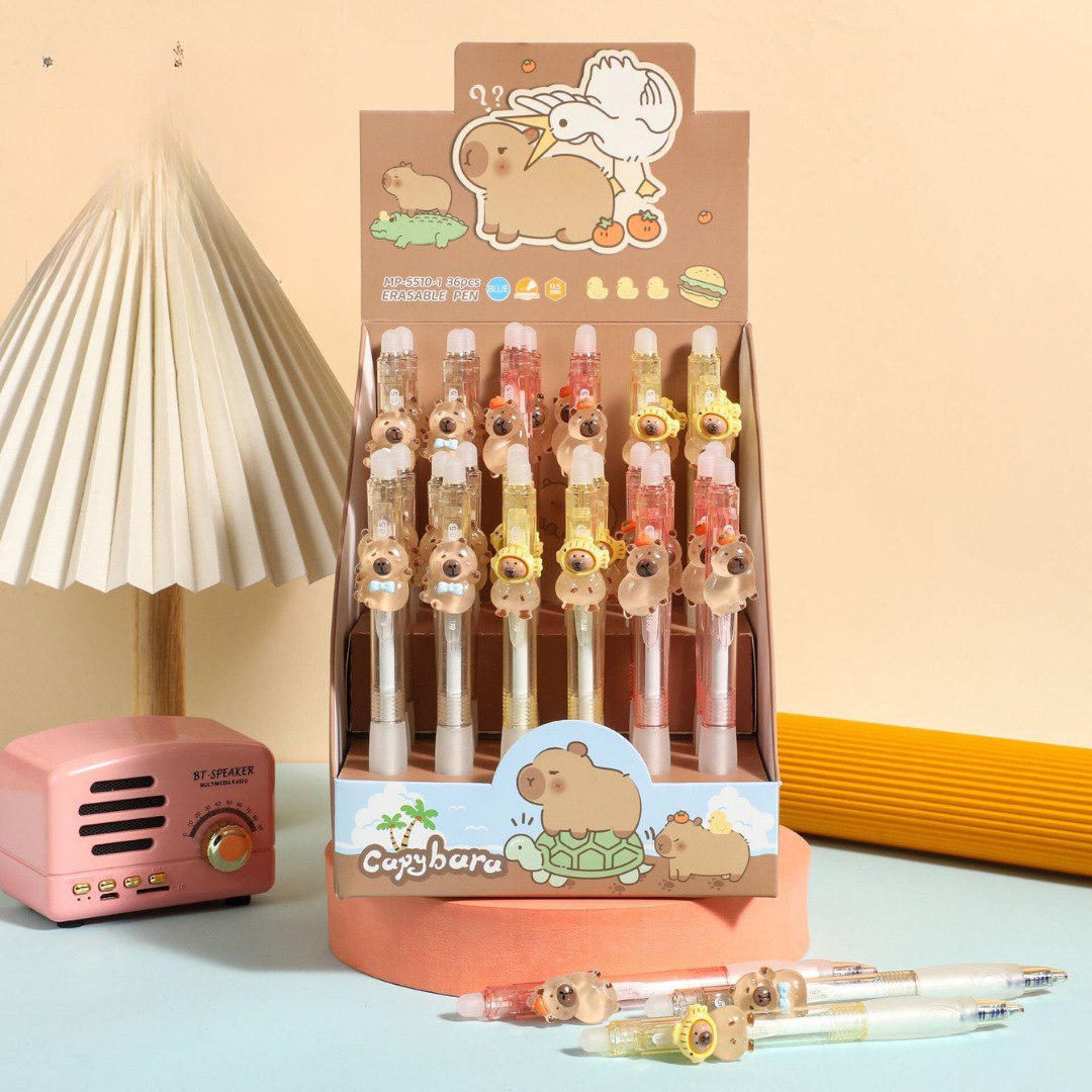 Escribe y corrige fácilmente con este lápiz de tinta gel borrable decorado con divertidos diseños de capybara. Hecho de plástico