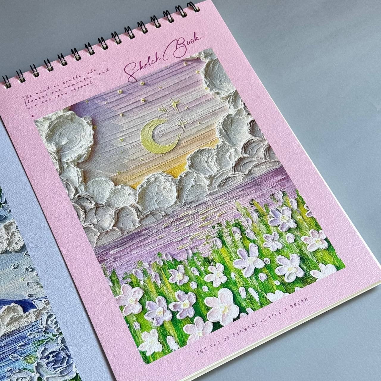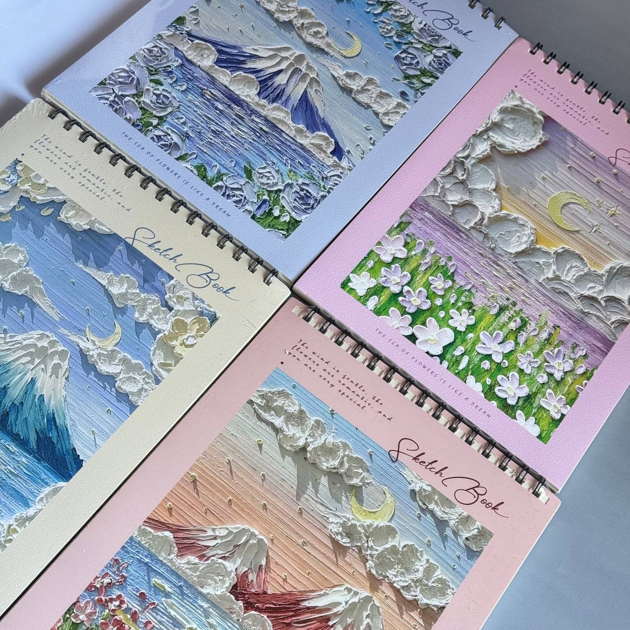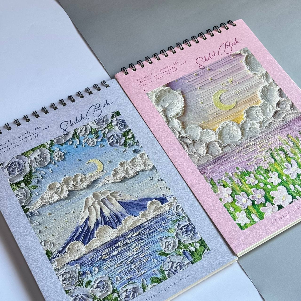 Diseñada para artistas y amantes del journaling visual, esta libreta incluye páginas blancas ideales para bocetos, pintura ligera y dibujo. Portadas vintage con paisajes.