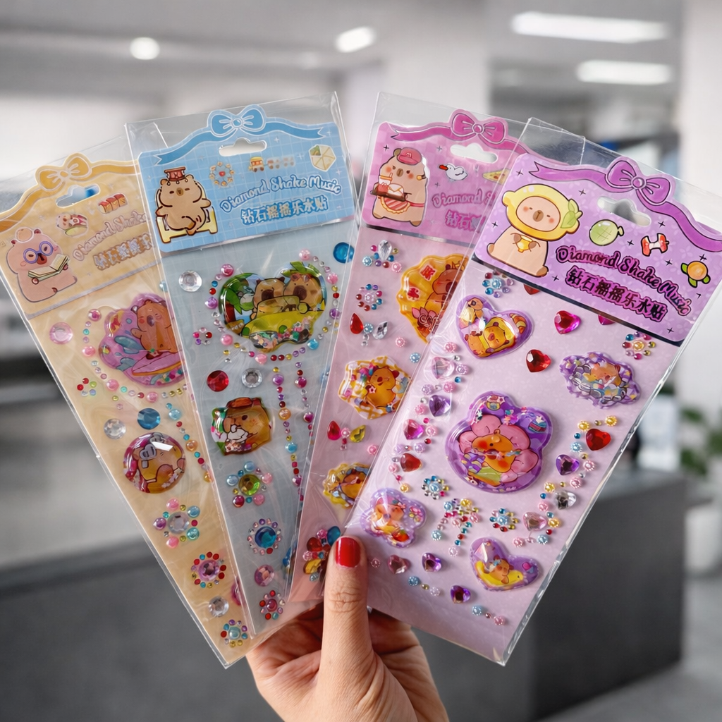 - Diseño: Stickers de capybara con detalles brillantes y glitter.