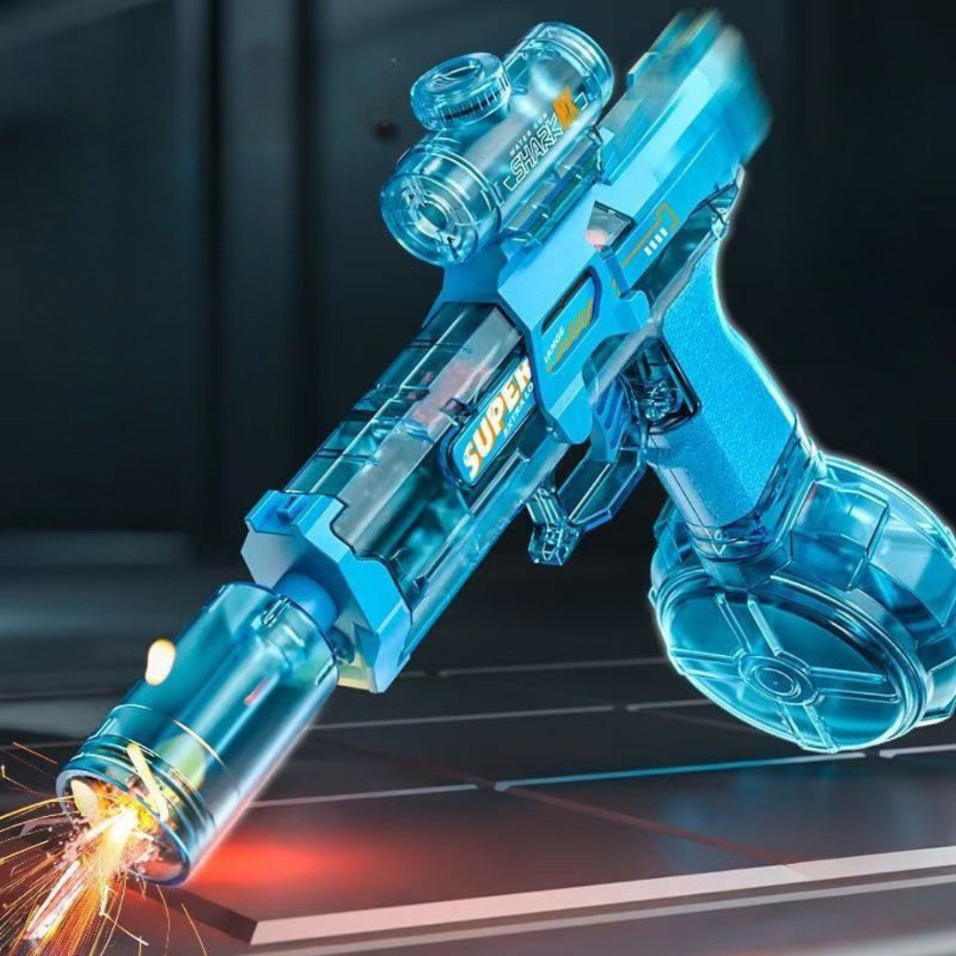 ¡Diversión asegurada para los más pequeños! Esta pistola de agua eléctrica destaca por su diseño moderno y funciones interactivas: