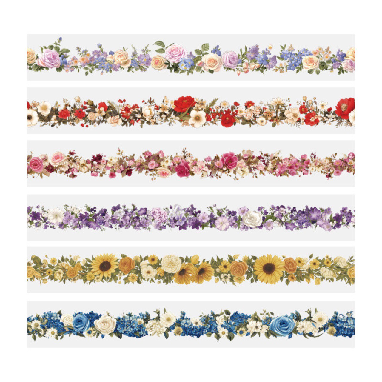 Gracias a su acabado transparente, los diseños se integran perfectamente con el fondo, logrando un efecto limpio y armonioso en cualquier superficie. Cada cinta presenta ilustraciones florales suaves y decorativas, perfectas para dar un toque romántico y creativo a tus páginas.